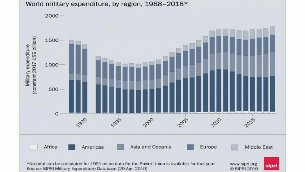 Общие военные расходы в мире выросли до $1,8 трлн в 2018 году, что на 2,6% больше, чем в 2017 году. Об этом говорится в отчете Стокгольмского международного института исследования проблем мира (SIPRI).