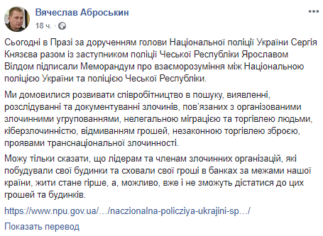 Украинские и чешские правоохранители договорились о сотрудничестве в сферах борьбы с организованной преступностью, торговлей людьми и других. Об этом написал заместитель главы Нацполиции Вячеслав Аброськин на своей странице в Facebook.