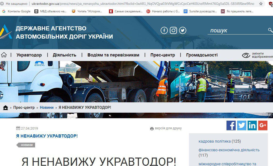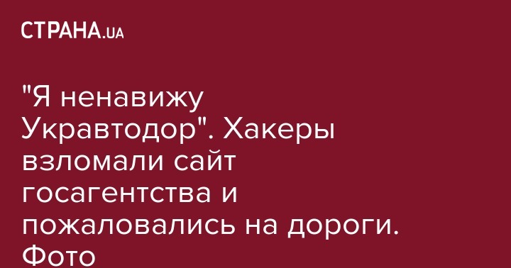 Неизвестные взломали сайт "Укравтодора" и выложили на нем публикацию "Я ненавижу Укравтодор", посвященную ужасному состоянию дорог в Украине.