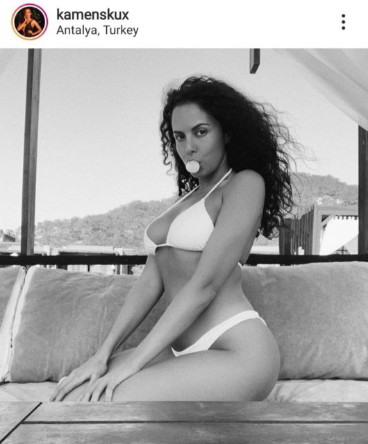 Каменских выложила новый снимок, на котором она в белоснежном купальнике загорает на пляже Анталии. Певица демонстрирует подтянутую фигуру, сидя за пляжным столиком. Макияжа на лице Насти нет, волосы растрепаны ветром. Певица выдувает ртом пузырь из жвачки. На снимок наложен черно-белый фильтр.