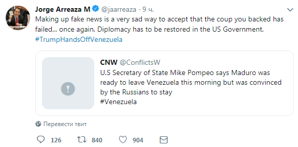 При этом глава МИД Венесулы Хорхе Арреаса подчеркнул в своем Twitter, что информация о том, что президент Венесуэлы Николас Мадуро якобы собирался бежать из страны - фейк.