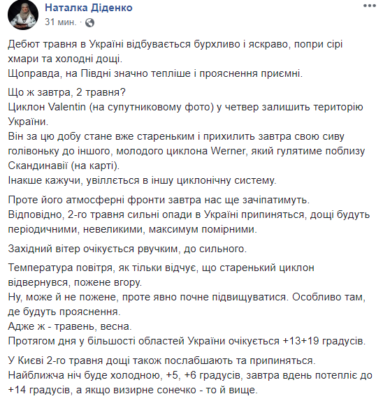 В Украине погодный дебют мая будет происходить бурно и ярко, несмотря на серые облака и холодные дожди. Уже в четверг, 2 мая, на Юге Украины значительно потеплеет и прояснится, а циклон Valentin покинет территорию Украины. Об этом сообщает синоптик Наталья Диденко на своей странице в Facebook.