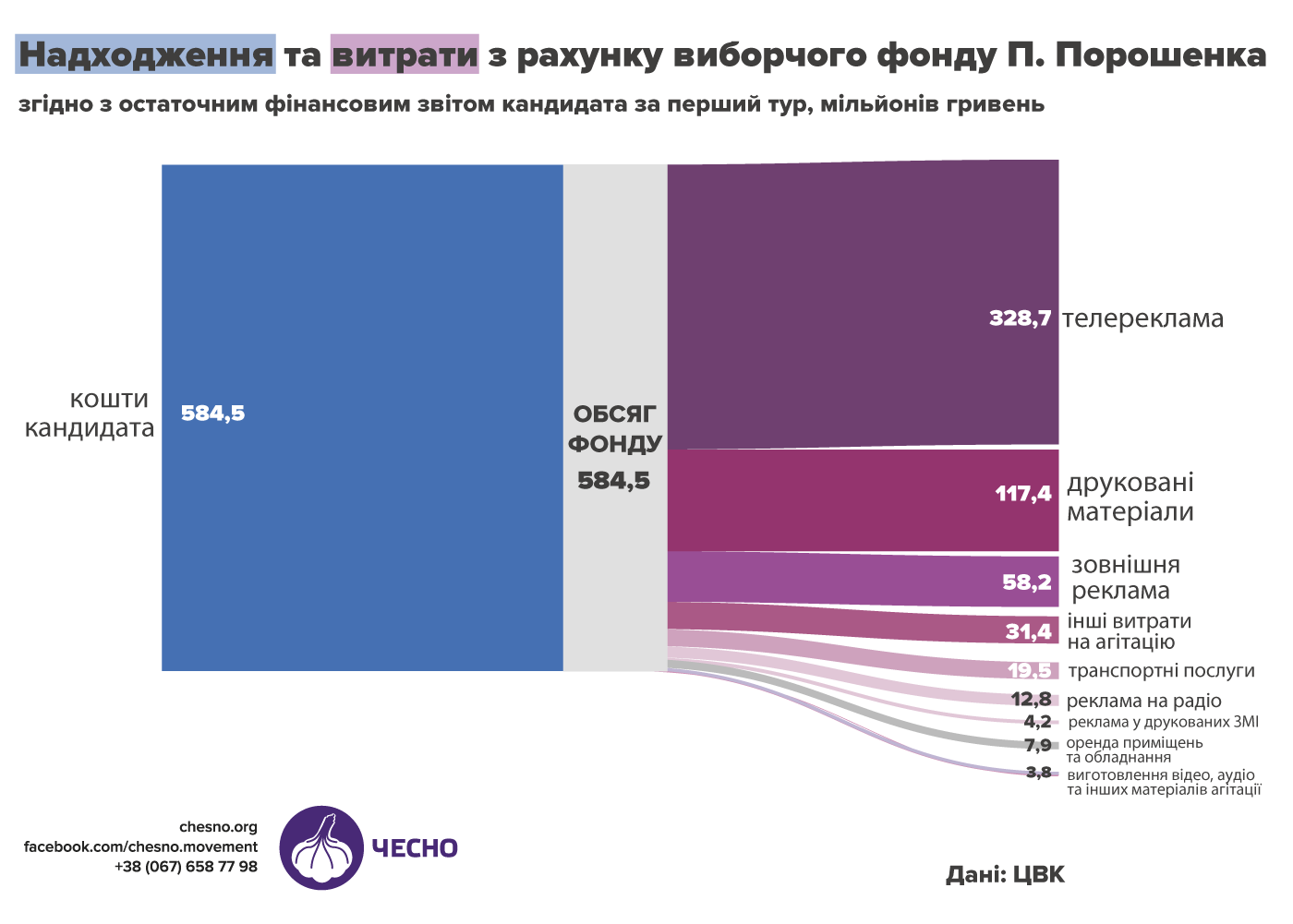 Так, всего Петр Порошенко потратил на избирательную кампанию 585 млн гривен, выступив единственным ее донором. По результатам анализа окончательного финансового отчета Порошенко за расходы в первом туре выборов оказалось, что избирательный фонд Порошенко был в 4 раза больше, чем у победившего на выборах Владимира Зеленского.