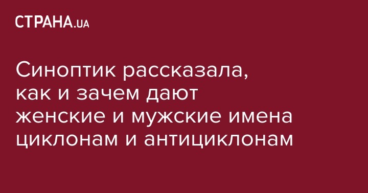 В среду, 1 мая, синоптик Наталья Диденко рассказала, почему циклонам дают разные имена. Об этом она сообщила на своей странице в соцсети Facebook.