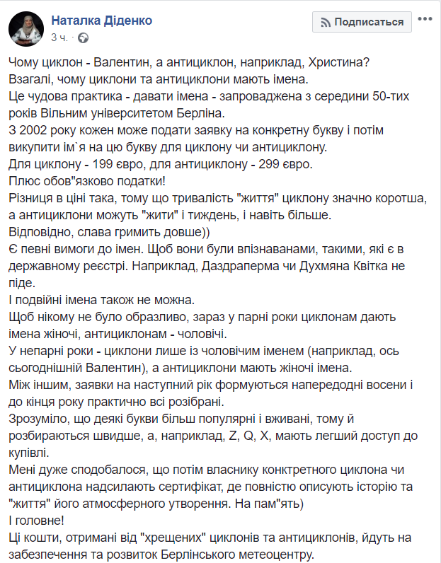 "С 2002 года каждый может подать заявку на конкретную букву и потом выкупить имя на эту букву для циклона или антициклона. Для циклона - 199 евро, для антициклона - 299 евро. Плюс обязательно налоги!", - пишет синоптик.