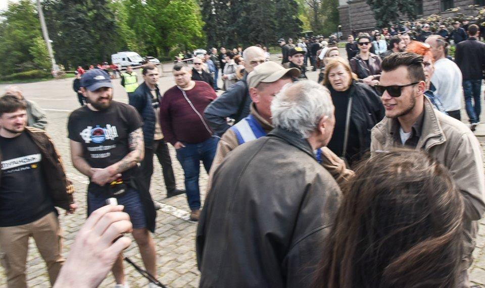 Прибывших ребят обступили люди, которые пришли почтить память погибших. Вскоре началась толкотня и словесная перепалка. При этом молодые парни постоянно кричат "Слава Украине". С обеих сторон слышны оскорбления, а обстановка накалена.