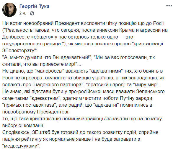 Замминистра  по делам оккупированных территорий Георгий Тука заявил, что часть электората Зеленского разочарована.