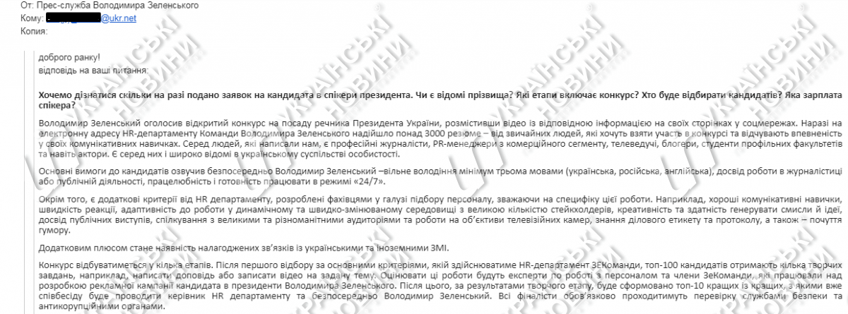 "На данный момент на электронный адрес HR-департамента команды Владимира Зеленского пришло более 3 тысяч резюме - от обычных людей, которые хотят принять участие в конкурсе и чувствуют уверенность в своих коммуникационных способностях", - говорится в ответе.