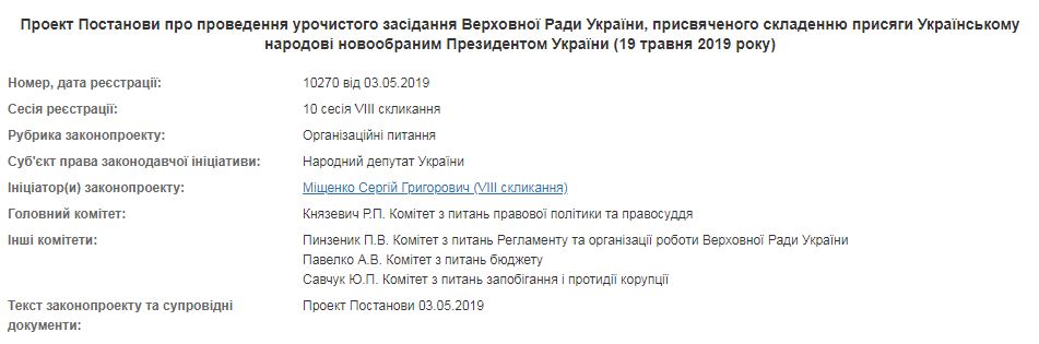 В парламенте сегодня, 3 мая, зарегистрирован проект постановления о проведении торжественного заседания Верховной Рады Украины, посвященного принесению присяги новоизбранным президентом Украины Владимиром Зеленским (19 мая 2019 года).