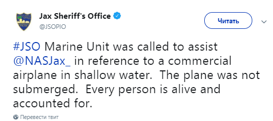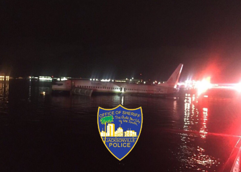 В США авиалайнер Boeing 737 со 136 пассажирами на борту съехал со взлетно-посадочной полосы и рухнул в реку Сент-Джонс возле Джексонвилла, штат Флорида. Об этом в Twitter сообщил офис шерифа города.