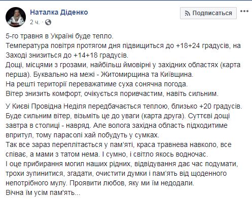 "Так все сейчас переплетается в памяти, красота майская вокруг, все поет, а мамы с папой нет. И грустно, и светло как-то одновременно. И вот уборка могил наших родных, посещение дает время подумать, немного остановиться, вспомнить, очистить мысли и память от ежедневного ненужного ила. Проявить любовь, которую мы им недодали. Вечная им всем память..", - резюмировала Диденко.