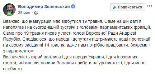 "Считаю, что инаугурация должна состояться 19 мая. Именно на этой дате я настаивал и на сегодняшней встрече с главами парламентских фракций. Именно о 19 мая писал в письме председателю Верховной Рады Андрею Парубию. Надеюсь, что народные депутаты поддержат наши предложения на своем заседании 14 мая, ведь нам нужно работать. В частности и с парламентом. Определенность крайне важна и для народа Украины, и для иностранных гостей, которые уже выразили желание прибыть на торжества, и для меня лично", - написал Зеленский.