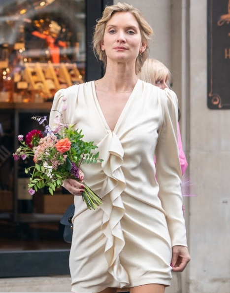 На девушке было кремовое мини-платье, шляпка с вуалью и пудрово-розовые туфли на высоких каблуках. В руках она держала букет полевых цветов.
