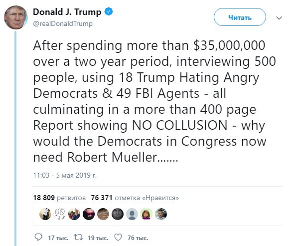 "Преступлений не было, кроме совершавшихся другой стороны (и что, удивительным образом не нашло отражения в докладе), и не было препятствования правосудию. Роберту Мюллеру не следует давать показания. Никаких переделок для демократов!", - добавил президент.