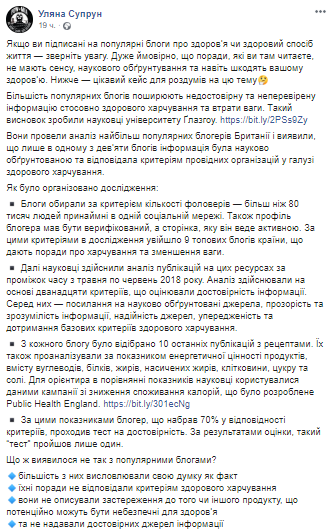 Большинство популярных блогов распространяют недостоверную и непроверенную информацию о здоровом питании и потере веса. Об этом сообщила на своей странице в соцсети и.о. министра здравоохранения Ульяна Супрун, ссылаясь на ученых университета Глазго.
