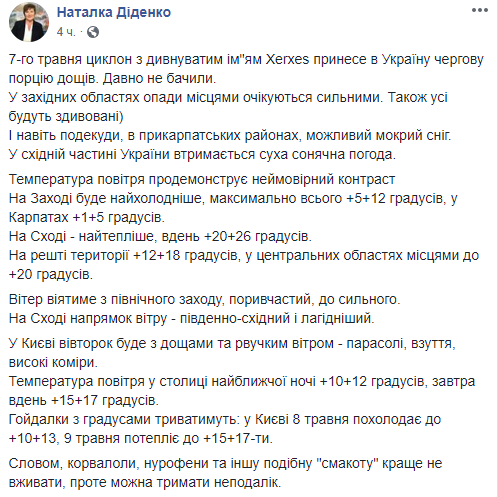Во вторник, 7 мая, Украину накроет циклон Xerxes. Он, как и циклон Valentin, принесет с собой в страну дожди. Об этом сообщает синоптик Наталья Диденко на своей странице в Facebook.