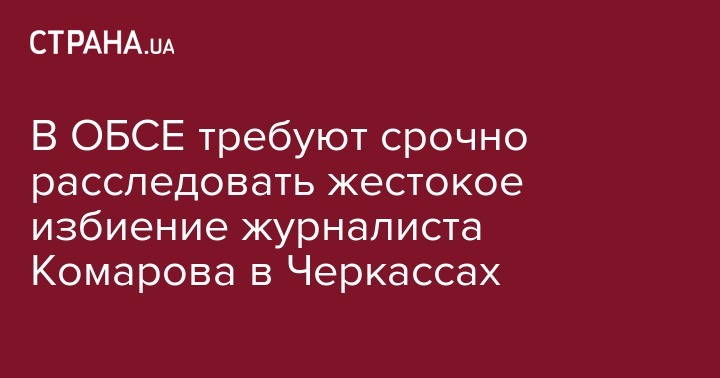 Напомним, местный журналист и блогер Вадим Комаров, известный своими отчетами о коррупции, подвергся нападению утром 4 мая в центре Черкасс. Он получил несколько ударов по голове и все еще находится в коме после операции в местной больнице. "Я надеюсь, что Вадим Комаров скоро полностью выздоровеет и что он и его коллеги будут защищены от насилия и запугивания", - сказал представитель ОБСЕ.