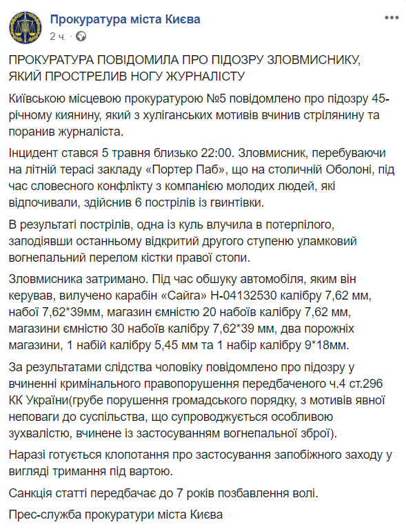 Сотрудники Киевской местной прокуратуры №5 сообщили о подозрении 45-летнем жителю столицы, который открыл стрельбу в одном из баров на Оболони и ранил журналиста. Об этом сообщает пресс-служба прокуратуры в соцсети Facebook.