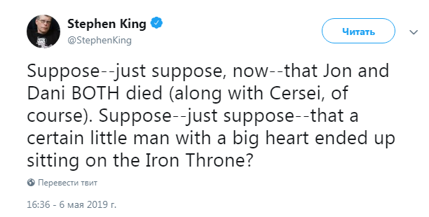 "Предположим, - просто предположим, сейчас - что Джон и Данни оба умерли (вместе с Серсеей, конечно). Предположим, - просто предположим, - что один маленький человек с большим сердцем в конечном итоге окажется на Железном троне?", - написал Кинг.