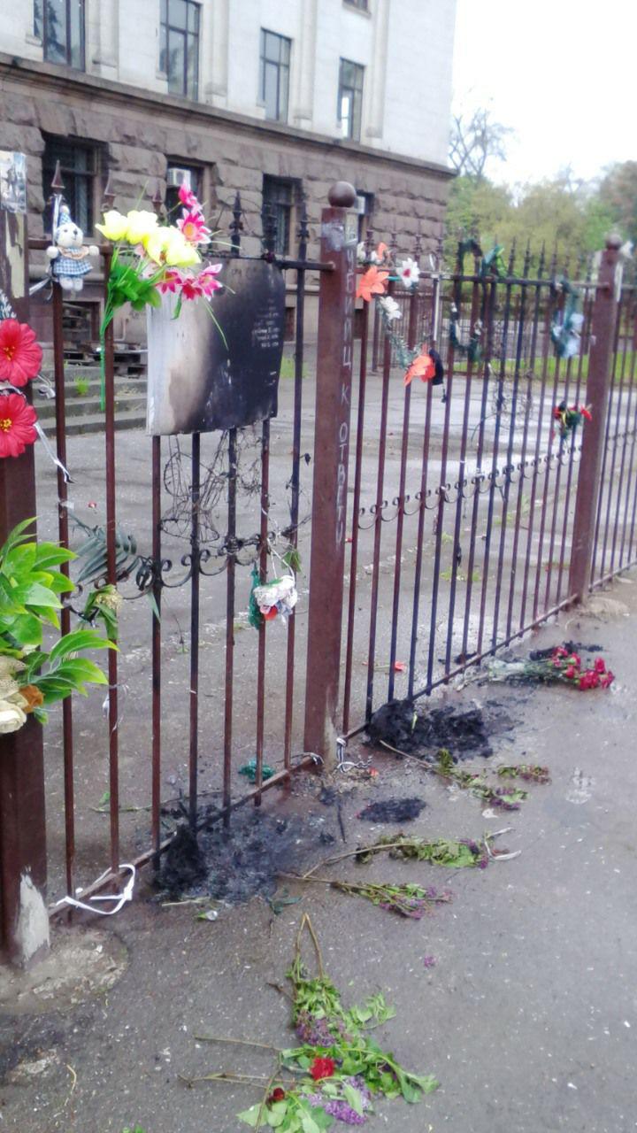 2 мая, в пятилетнюю годовщину массовой гибели одесситов в Доме профсоюзов, в течение всего дня горожане несли туда гвоздики, сирень, тюльпаны и розы в память о погибших. Однако уже к 7:00 следующего дня цветов и лампадок на земле у здания уже не было. Остались лишь памятные таблички и немного цветов на ограде. Их и сожгли неизвестные.
