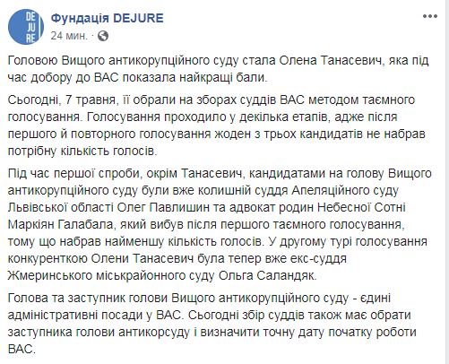 Судьи Высшего антикоррупционного суда Украины (ВАКС) 7 мая путем тайного голосования избрали председателем суда Елену Танасевич. Об этом сообщает в Facebook Фундация DEJURE.