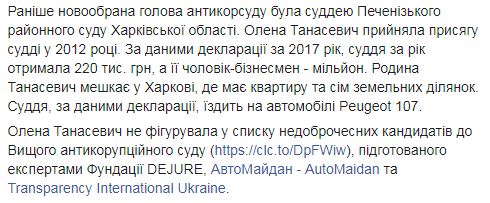 Ранее Елена Танасевич была судьей Печенежского районного суда Харьковской области. Она приняла присягу судьи в 2012 году. По данным декларации за 2017 год, судья за год получила 220 тыс. грн, а ее муж-бизнесмен - миллион. Семья Танасевич живет в Харькове, где имеет квартиру и семь земельных участков. Судья, по данным декларации, ездит на автомобиле Peugeot 107. Отмечается, что Танасевич не фигурировала в списке недобропорядочных кандидатов в Высший антикоррупционного суда.