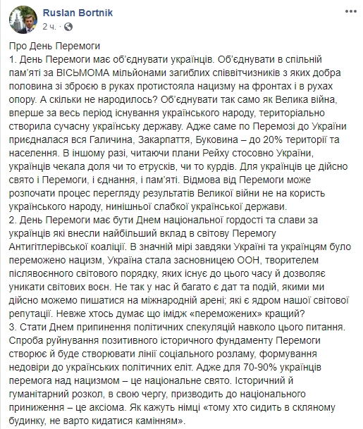 "О Дне Победы. 1. День Победы должен объединять украинцев. Объединять в общей памяти о восьми миллионах погибших соотечественников, из которых добрая половина с оружием в руках противостояла нацизму на фронтах и ​​в движениях сопротивления. А сколько не родились? Объединять так же, как Великая война, впервые за весь период существования украинского народа, территориально создала современное украинское государство. Ведь именно после Победы к Украине присоединилась вся Галичина, Закарпатье, Буковина - до 20% территории и населения. В противном случае, читая планы Рейха в отношении Украины, украинцев ждала судьба или этрусков, то курдов. Для украинцев это действительно праздник и Победы, и единения, и памяти. Отказ от Победы может начать процесс пересмотра результатов Великой войны не в интересах украинского народа, нынешнего слабого украинского государства.