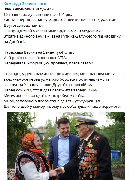 Команда избранного президента Владимира Зеленского опубликовала в Telegram фото двух ветеранов с подписью: "Иван Аникеевич Залужный. 10 мая ему исполнится 101 год. Капитан первого ранга морской пехоты ВМФ СССР, участник Второй мировой войны. Награжден многочисленными орденами и медалями. Потерял единственного внука - Ивана Гутника-Залужного во время войны в Донбассе.