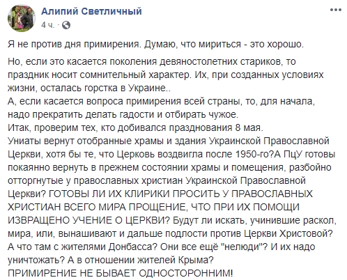 Архимандрит Алипий Светличный: "Я не против дня примирения. Думаю, что мириться - это хорошо. Но, если это касается поколения девяностолетних стариков, то праздник носит сомнительный характер. Их, при созданных условиях жизни, осталась горстка в Украине.
