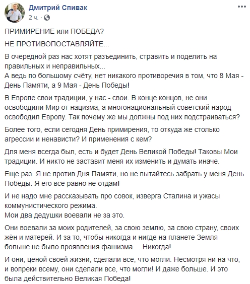 Одесский депутат Дмитрий Спивак: "Примирение или победа? Не противопоставляйте. В очередной раз нас хотят разъединить, стравить и поделить на правильных и неправильных... А ведь по большому счёту, нет никакого противоречия в том, что 8 Мая - День Памяти, а 9 Мая - День Победы!