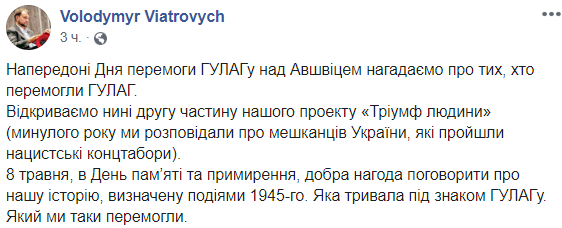 В еще более примирительном тоне глава Институт нацпамяти Владимир Вятрович назвал сегодня 9 мая "Днем победы ГУЛАГа  над Аушвицем".