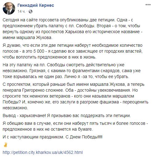 Мэр Харькова Геннадий Кернес призвал горожан поддержать петицию об обратном переименовании проспекта имени Петра Григоренко в проспект имени маршала Жукова. Об этом он написал на своей странице в Facebook.