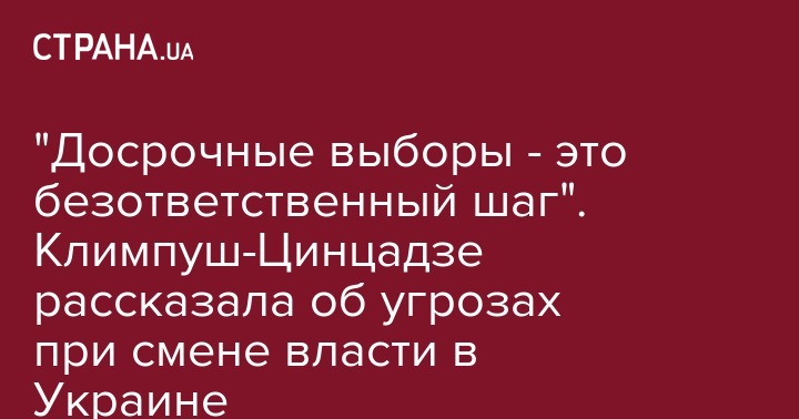 Смена президента - это угроза для безопасности Украины, а проведение досрочных выборов в Верховную Раду может оказаться безответственным шагом. Об этом заявила вице-премьер-министр по вопросам европейской и евроатлантической интеграции Украины Иванна Климпуш-Цинцадзе, сообщает УНН.