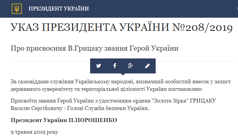 Присвоить звание Герой Украины с вручением ордена "Золотая Звезда" Грицаку Василию Сергеевичу - Председателю Службы безопасности Украины", - говорится в документе, подписанном Петром Порошенко.