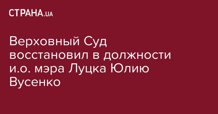 Кассационный административный суд Верховного Суда восстановил Юлию Вусенко в должности секретаря Луцкого городского совета и исполняющего обязанности мэра города. Об этом со ссылкой на материалы суда пишут "Украинские Новости".