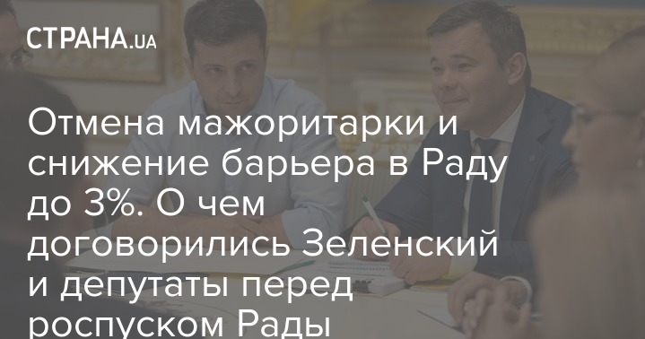 Как уже вчера рассказывала "Страна", сразу после инаугурации Зеленского представители фракций-аутсайдеров собрались на совещание и решили предложить Зеленскому обмен: они согласны проголосовать за отмену мажоритарки - а он в свою очередь согласится на снижение проходного барьера до 3%.