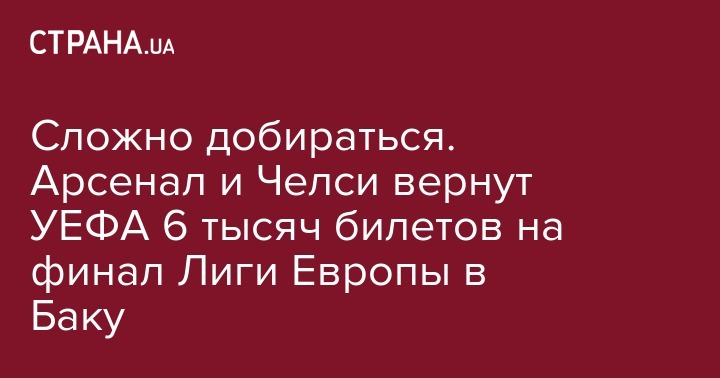 Финалисты Лиги Европы собираются отказаться от части билетов, которые были выделены для них. Всего Арсенал и Челси вернут около 6 000 билетов, так как продали только 3 500 и 2 000 тикетов соответственно, сообщает The Times. Данное решение принято из-за малой пропускной способности аэропорта в Баку.