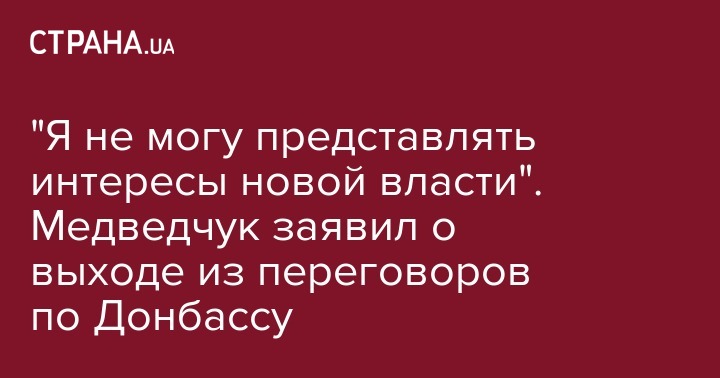 "Я не могу представлять интересы новой власти в переговорах с Россией с учетом позиции господина Зеленского по следующим принципиальным для меня вопросам, которые я отстаивал и буду отстаивать... Я выступаю за возвращение Донбасса на Украину, а Украины в Донбасс. Позиция господина Зеленского, которую он сформулировал, полностью противоречит моему мирному плану, предусматривающему автономию для этих территорий", - заявил Медведчук.