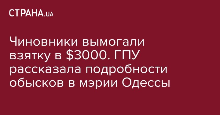 Сегодня, 28 мая, правоохранители провели обыски в мэрии Одессы в связи с вымогательством и получением взятки в размере $3 тысячи главным специалистом отдела горсовета и директором коммунального учреждения "Одесский зоологический парк общегосударственного значения". Об этом сообщает пресс-служба Генпрокуратуры.