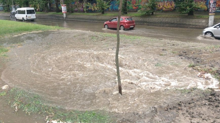 Прорыв произошел около 13:00, вода продолжает заливать бульвар и пешеходную зону проспекта. Фонтан бьет на месте известной городской "Садовой низины" - самой низкой, относительно уровня моря, точке города.