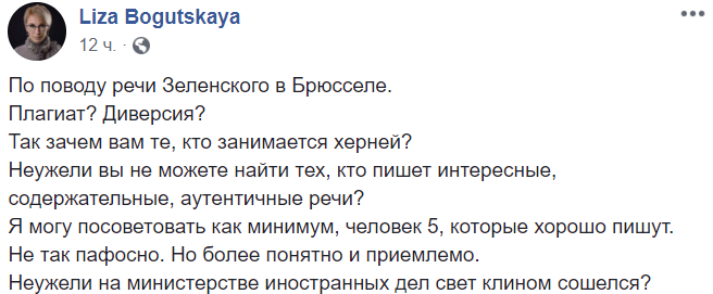 "По поводу речи Зеленского в Брюсселе. Плагиат? Диверсия? Так зачем вам те, кто занимается х...рней? Неужели вы не можете найти тех, кто пишет интересные, содержательные, аутентичные речи?