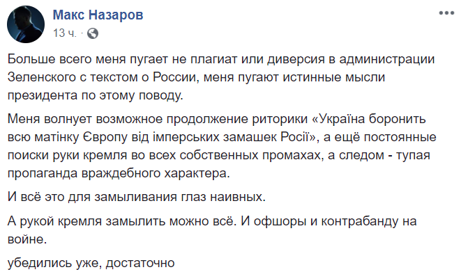 "Больше всего меня пугает не плагиат или диверсия в администрации Зеленского с текстом о России, меня пугают истинные мысли президента по этому поводу.
