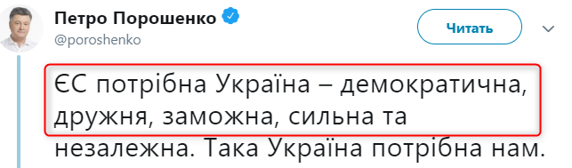 А вот изречение Порошенко с того же съезда "Европейской солидарности": "ЄС потрібна Україна – демократична, дружня, заможна, сильна та незалежна".