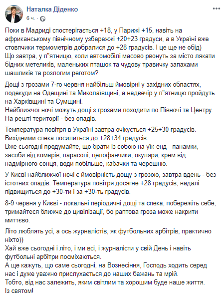 "8-9 июня в Киеве - локальные периодические дожди и жара, поберегите себя, держитесь ближе к цивилизации, потому что внезапная гроза может накрыть мгновенно",- предостерегает Диденко.