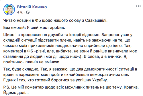 Около двух часов ночи мэр Киева и лидер политсилы опубликовал пост в Facebook, которым фактически подтвердил данную информацию, и прокомментировал ее.