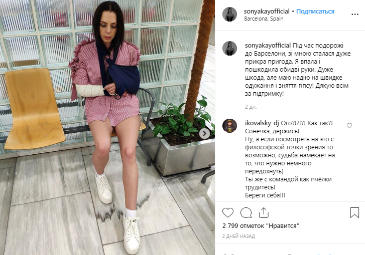 Украинская певица Соня Кай, племянница известной певицы Софии Ротару, написала, что сломала обе руки, путешествуя по Барселоне. Об этом девушка сообщила на своей странице в Instagram.