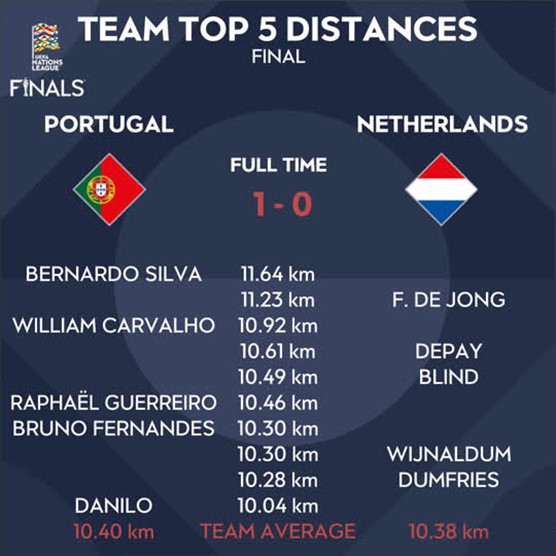 Больше всего пробежал сегодня на поле полузащитник сборной Португалии Бернарду Силва. На втором месте - нидерландский полузащитник Фрэнки де Йонг.