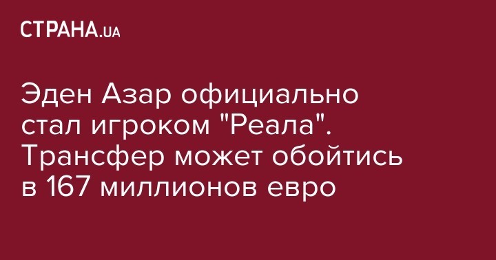 Полузащитник "Челси" и сборной Бельгии Эден Азар подписал контракт с мадридским "Реалом". Переход бельгийского полузащитника обошелся мадридскому клубу в 100 миллионов евро без учета возможных бонусов. Об этом сообщает пресс-служба Реала. О трансфере было объявлено 7 июня.