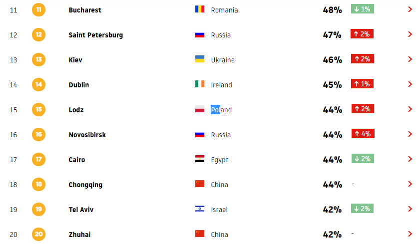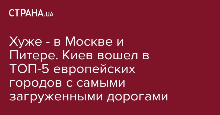 Среди европейских городов первой оказалась Москве (5 место в общем рейтинге). Далее расположились румынский Бухарест (11 место) и Санкт-Петербург (12 место). Далее - Киев (13 место). Самые свободные дороги оказались у городов Кадис (Испания) и Гринсборо Хайпойнт (США) с 9%.