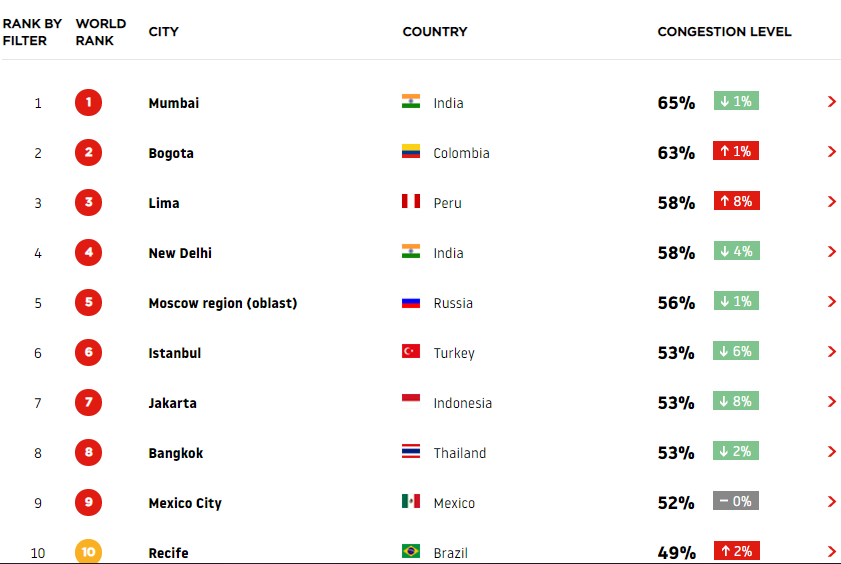 В тройку городов мира с самыми загруженными дорогами вошли Мумбаи (Индия), Боготы (Колумбия), Лима (Перу). Загруженность 65, 63 и 58% соответственно.